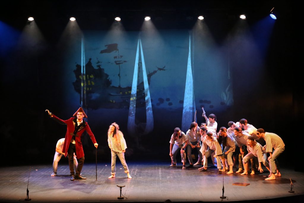 50 apprentis-comédiens et comédiens confirmés, chanteurs, danseurs dévoilent les arcanes de l’île des enfants perdus, autour de Stomp pour la partie corporythmie.